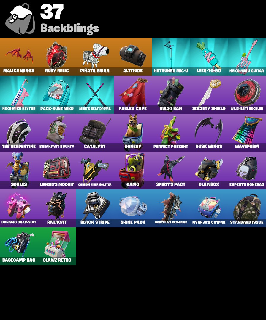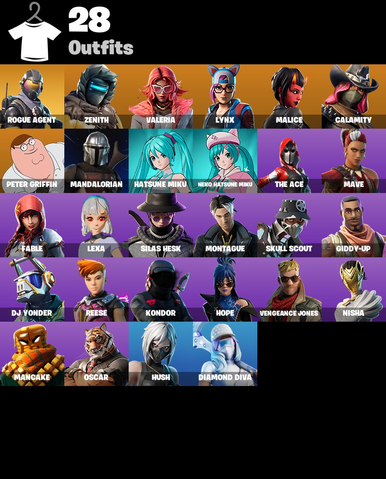 • Rogue Agent | Zenith | Valeria || backpack: Malice Wings | pickaxe: Beastfang | emote: Miku Miku Beam | glider: Eagle’s Form