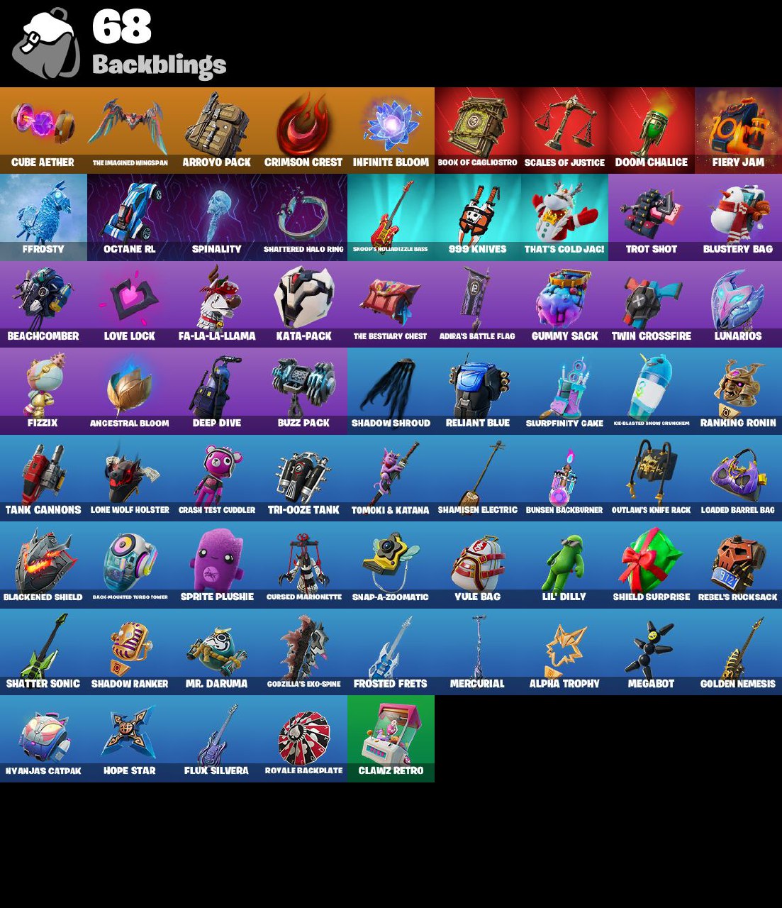 • Trilogy | Ronin | The Origin || backpack: Cube Aether | pickaxe: Electro Pairing Blades | emote: Wakandan Salute | glider: Astroworld Cyclone