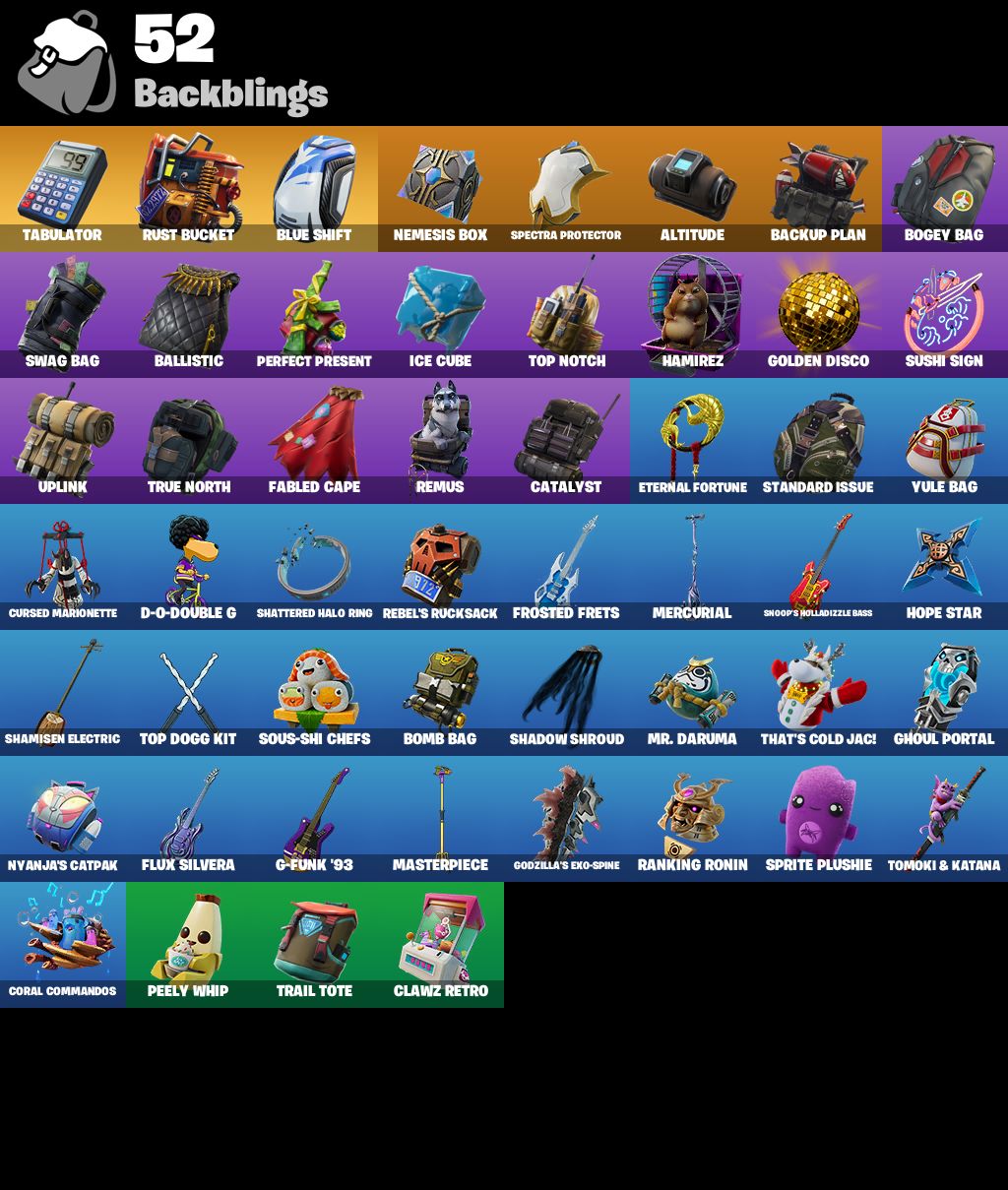 • Rogue Agent | Sub Commander | Havoc || backpack: Tabulator | pickaxe: Instigator | emote: Freestylin’ | glider: Royale Rider